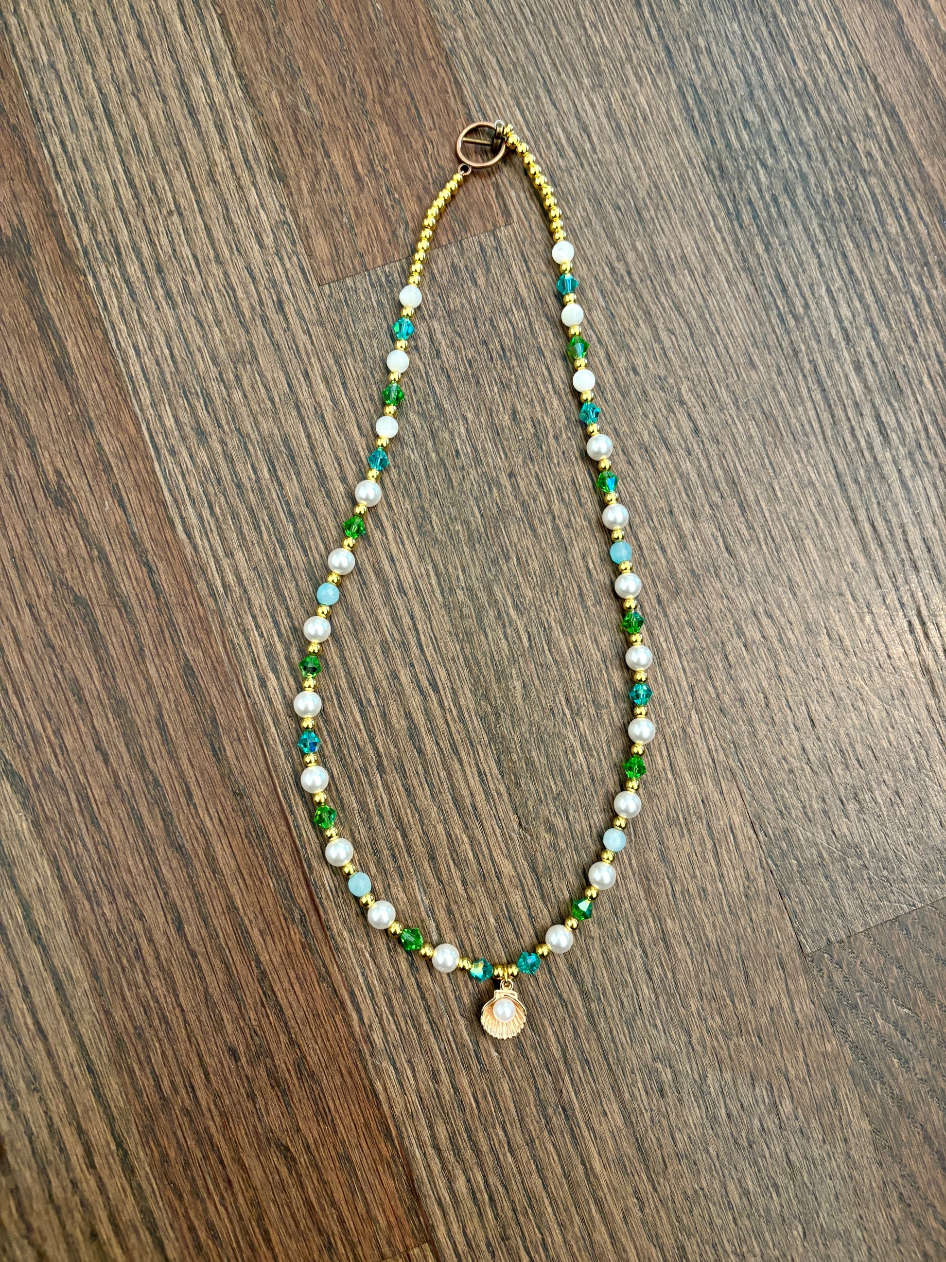 Handmade on the shores of Lake Michigan, this necklace is infused with the spirit of summer swims and beachside adventures. Shimmering pearls and emerald-green crystals flow together like sunlight on water, while a golden seashell pendant with a pearl center anchors the piece in pure mermaid magic. Perfect for ocean dreamers and lake lovers alike, this necklace embodies the joy of diving into summer with freedom and grace.