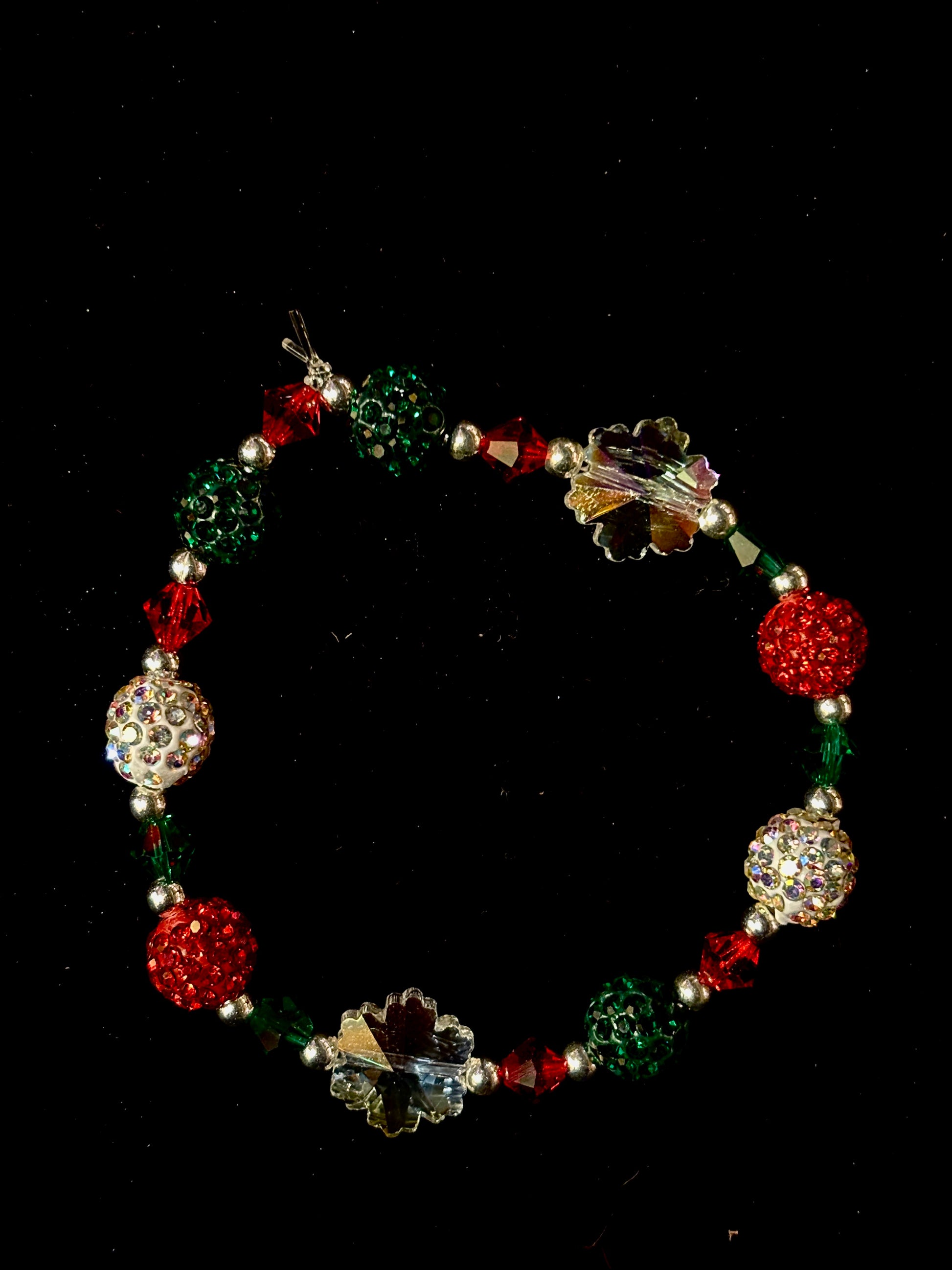 A bold mix of red and green rhinestone beads, icy crystal snowflake, and shimmering accents makes this bracelet shine from every angle. A perfect holiday statement with tons of sparkle!