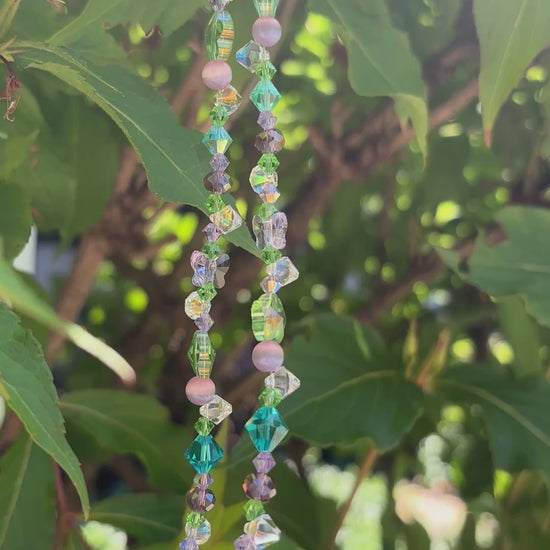Created for a wedding celebration, this necklace shines with the fresh sparkle of spring. Hand-strung entirely with crystal beads in soft purples, greens, and iridescent tones, it catches the light with every movement — like dew on new blossoms. Elegant yet playful, it’s a statement piece that feels at home at weddings, garden parties, or any moment you want to bring a touch of radiance.